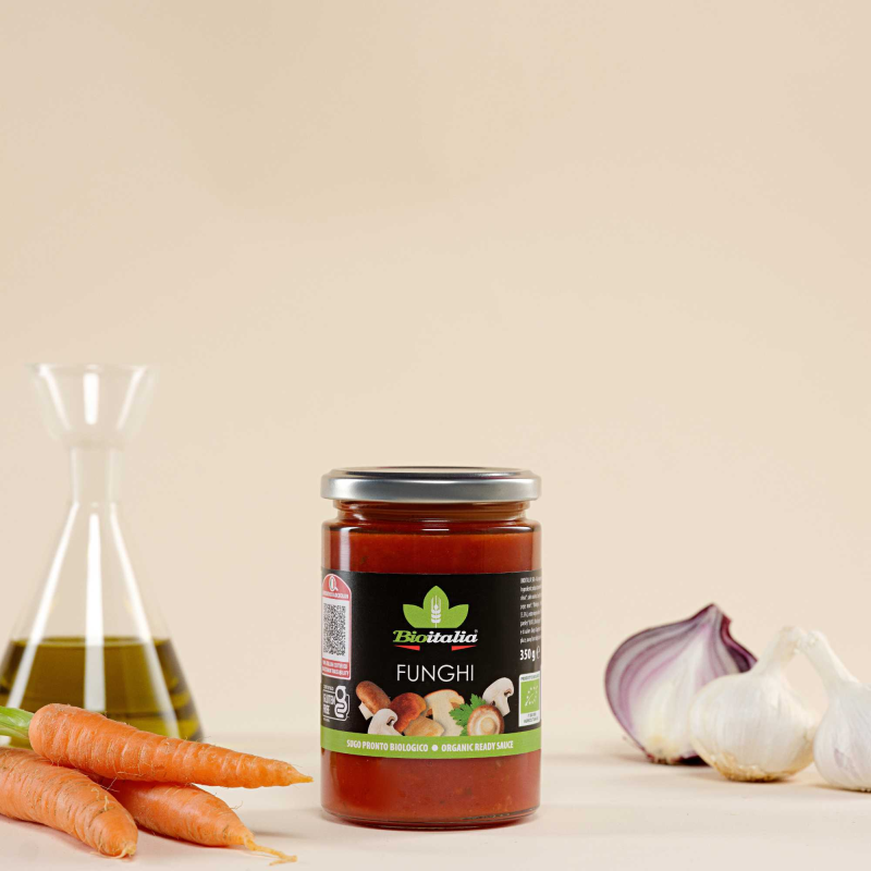 Organic chopped tomatoes (91,7%), organic white mushrooms (3,3%), organic extra virgin olive oil, sea salt, organic porcini mushrooms (0,5%), organic carrot, organic onion, organic garlic, organic parsley (0,03%), organic black pepper.