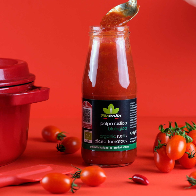 Tutto il profumo dei pomodori biologici italiani appena colti in una polpa rustica dal gusto unico.
