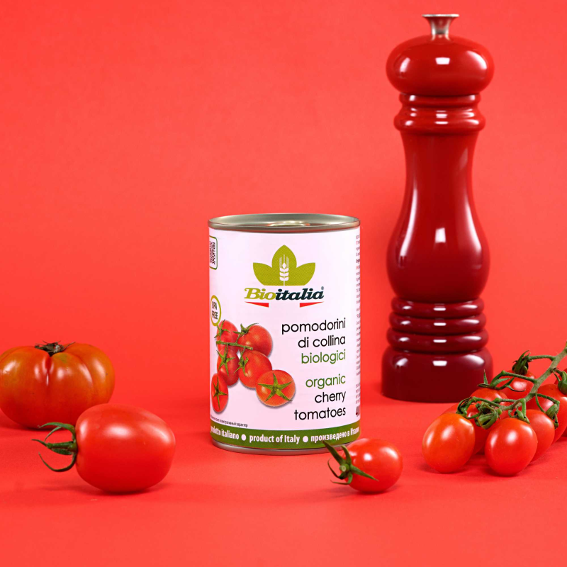 Pomodorini di collina biologici italiani e in particolare delle regioni del Sud Italia. Pomodorini interi conservati nel loro succo.